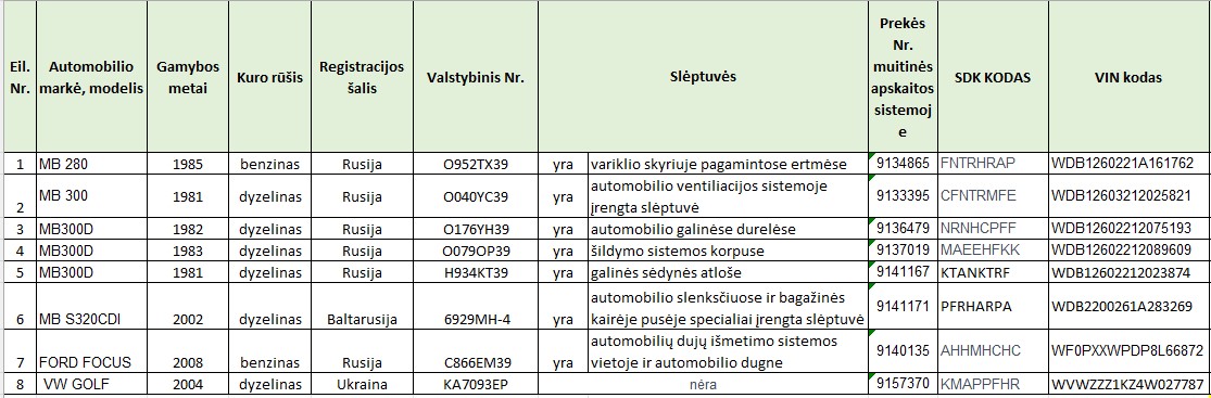 įvairių markių automobiliai su slėptuvėmis. Automobilių duomenys pateikti