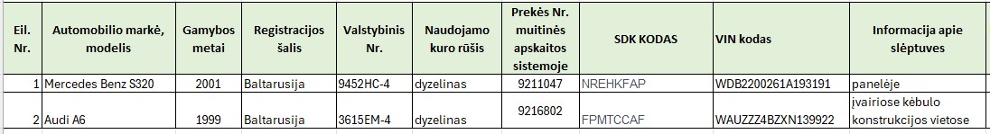 Skelbia ir vykdo Ne Sąjungos prekės transporto priemonių Mercedes Benz S320 ir Audi A6 pardavimą