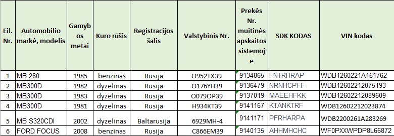 2023 m. rugsėjo 6-7 d. Muitinės departamentas skelbia ir vykdo Ne Sąjungos prekės – 6 įvairių markių transporto priemonių pardavimą