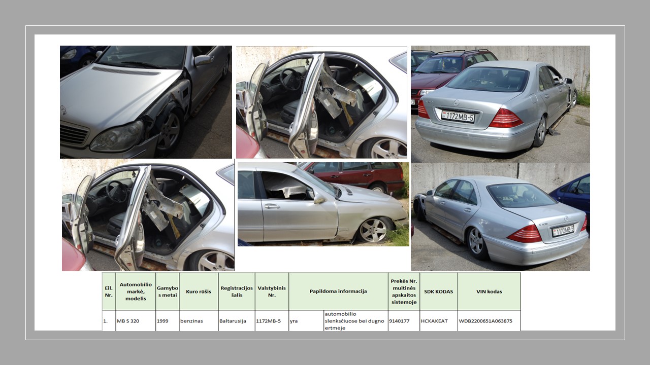 Kitos sąlygos: Mercedes Benz S320 turi jam suteiktą unikalų transporto priemonės savininko deklaravimo kodą (SDK). Automobilio būklė nustatoma aukciono dalyviui apžiūrint jį vietoje. Vadovaujantis Lietuvos Respublikos civilinio kodekso 6.333 straipsnio 8 punktu, kai daiktai parduodami teismo sprendimams vykdyti nustatyta tvarka, tai pardavėjas neprivalo garantuoti jų kokybės, o pirkėjas negali remtis tuo, kad pardavėjas pardavė netinkamos kokybės daiktą, išskyrus atvejus, kai apie parduodamo daikto trūkumus pardavėjas žinojo. Įgytos prekės atgal nepriimamos ir nekeičiamos, joms nesuteikiama jokia garantija. Parduotas automobilis, kuriame yra specialiai įrengtos slėptuvės, perduodamas aukciono laimėtojui be registracijos dokumentų ir valstybinių ženklų slėptuvių pašalinimui. Pirkėjas, įgytoje transporto priemonėje pašalinęs specialiai įrengtas slėptuves, muitinei pateikia pažymą apie jų pašalinimą, foto nuotraukas ir, esant būtinybei bei muitinei pareikalavus, pateikia pačią transporto priemonę apžiūrai muitinei priimtinoje vietoje. Panaikinus specialiai įrengtas slėptuves, rekomenduojame įrodymus apie jų panaikinimą pateikti muitinei tokia tvarka: 1. Nufotografuoti bendrą automobilio vaizdą automobilio markės, modelio bei spalvos identifikacijai; 2. Nufotografuoti panaikintą slėptuvę taip, kad būtų galima identifikuoti automobilį, kuriame ji buvo. Atsižvelgiat į buvusios slėptuvės vietą, gali būti pateiktos kelios nuotraukos; 3. Nufotografuoti panaikintą slėptuvę taip, kad matytųsi kokiu būdu ji buvo panaikinta bei kokios tam buvo naudotos medžiagos; 4. Pateikti pažymą apie slėptuvės pašalinimą, kurioje trumpai aprašyti slėptuvės panaikinimo būdą; 5.Slėptuvės panaikinimą įrodančias nuotraukas ir pažymą išsiųsti muitinei elektroniniu paštu audrone.cipliene@lrmuitine.lt. Muitinė, išnagrinėjusi pateiktą medžiagą, įvertina situaciją ir priima sprendimą dėl registracijos dokumentų ir valstybinių ženklų perdavimo pirkėjui. EORI kodo suteikimo tvarka patvirtinta Muitinės departamento generalinio direktoriaus 2015 m. gruodžio 16 d. įsakymu Nr. 1B-975 „Dėl Asmenų registravimo Muitinės prievolininkų registre, registravimo procedūros sustabdymo, registravimo procedūros atnaujinimo ir asmenų išregistravimo iš Muitinės prievolininkų registro taisyklių patvirtinimo“.
