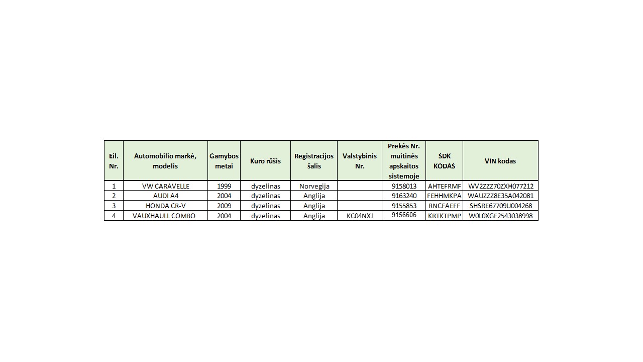 | Pavadinimas: | 2023 m. rugsėjo 6-7 d. Muitinės departamentas skelbia ir vykdo Ne Sąjungos prekės – 4 įvairių markių automobilių pardavimą |