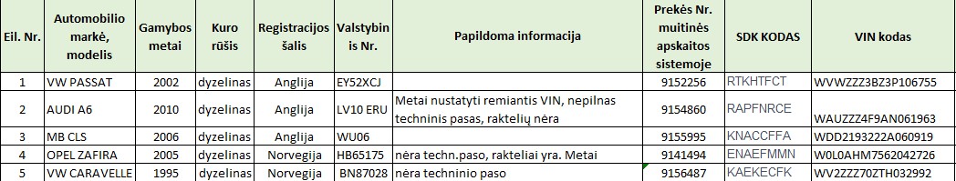 2023 m. spalio 4-5 d. Muitinės departamentas skelbia ir vykdo Ne Sąjungos prekės – 5 vnt. įvairių markių automobilių pardavimą